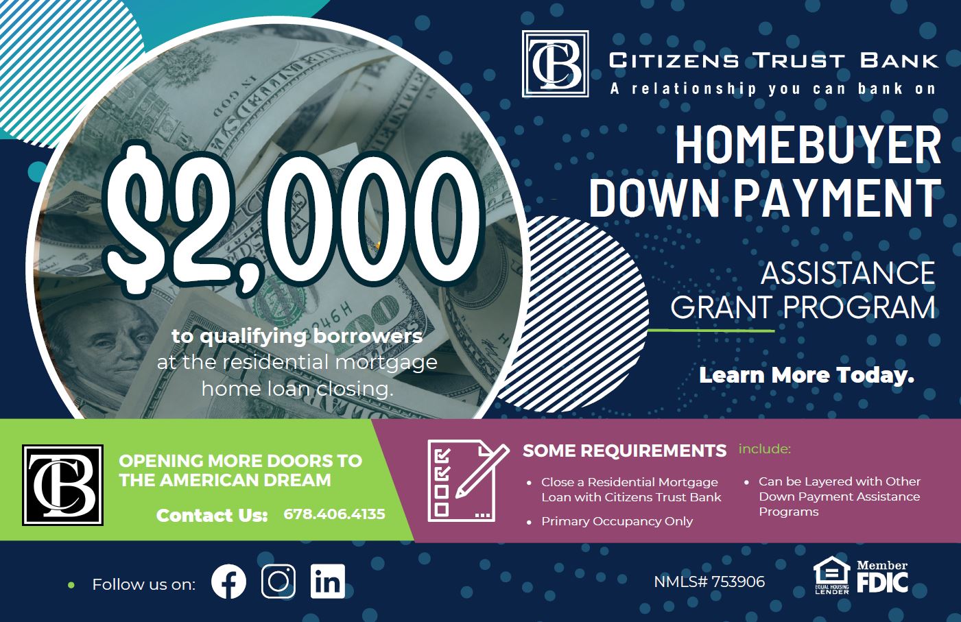 Partnered down payment assistance programs available through the Federal Home Loan Bank, Atlanta Housing Authortity, and the Chenoa Fund.